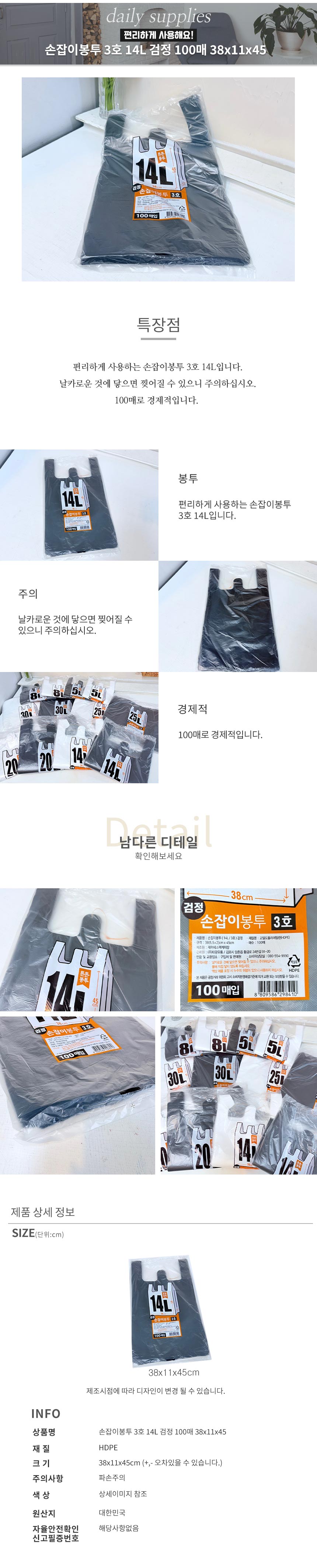 손잡이봉투 3호 14L 검정 100매 38x11x45