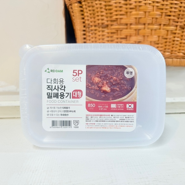 리담 다회용 직사각 밀폐용기 대형 5P 850ml