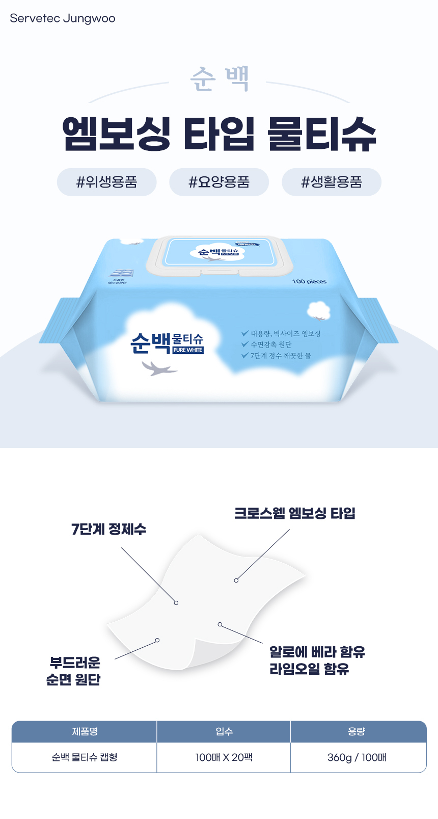 다용도 순백 물티슈 캡형 100매 20팩