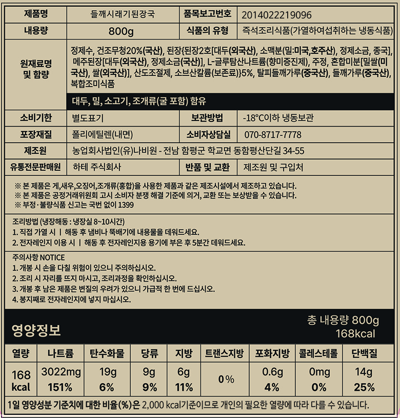 전라도 전통방식 시래기 들깨 된장국 800g x 1팩
