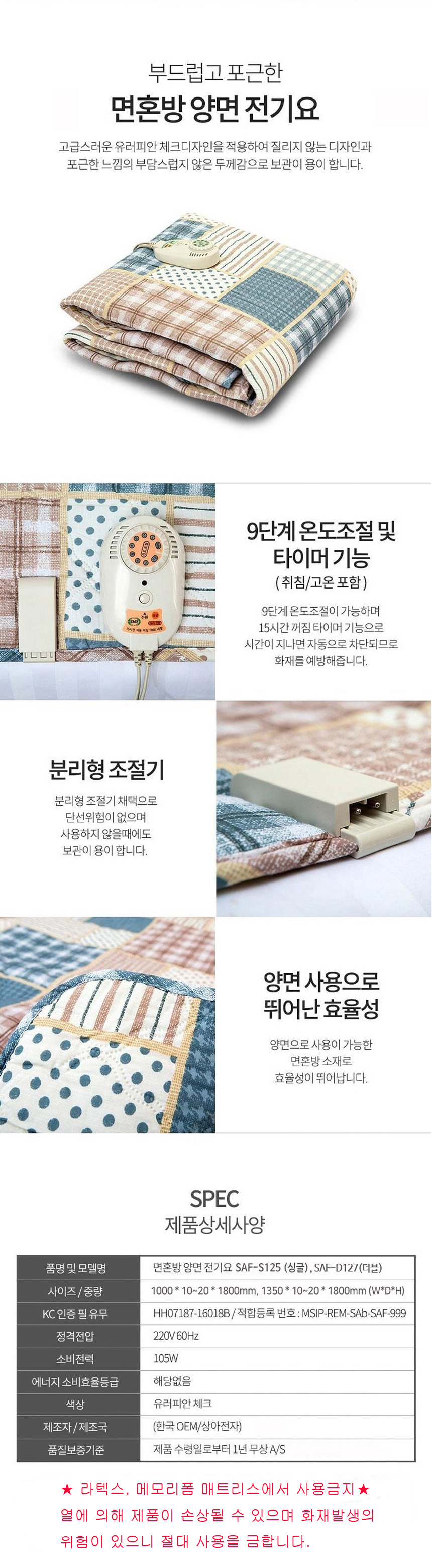 상아전자 면혼방 전기요(싱글) SAF-S125