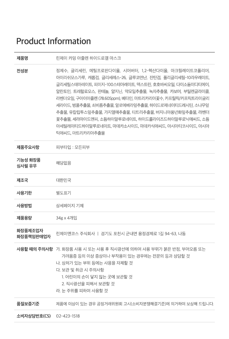 린제이 하이드로겔 1일1팩 아줄렌 수분 카밍 겔 마스크팩 4개입