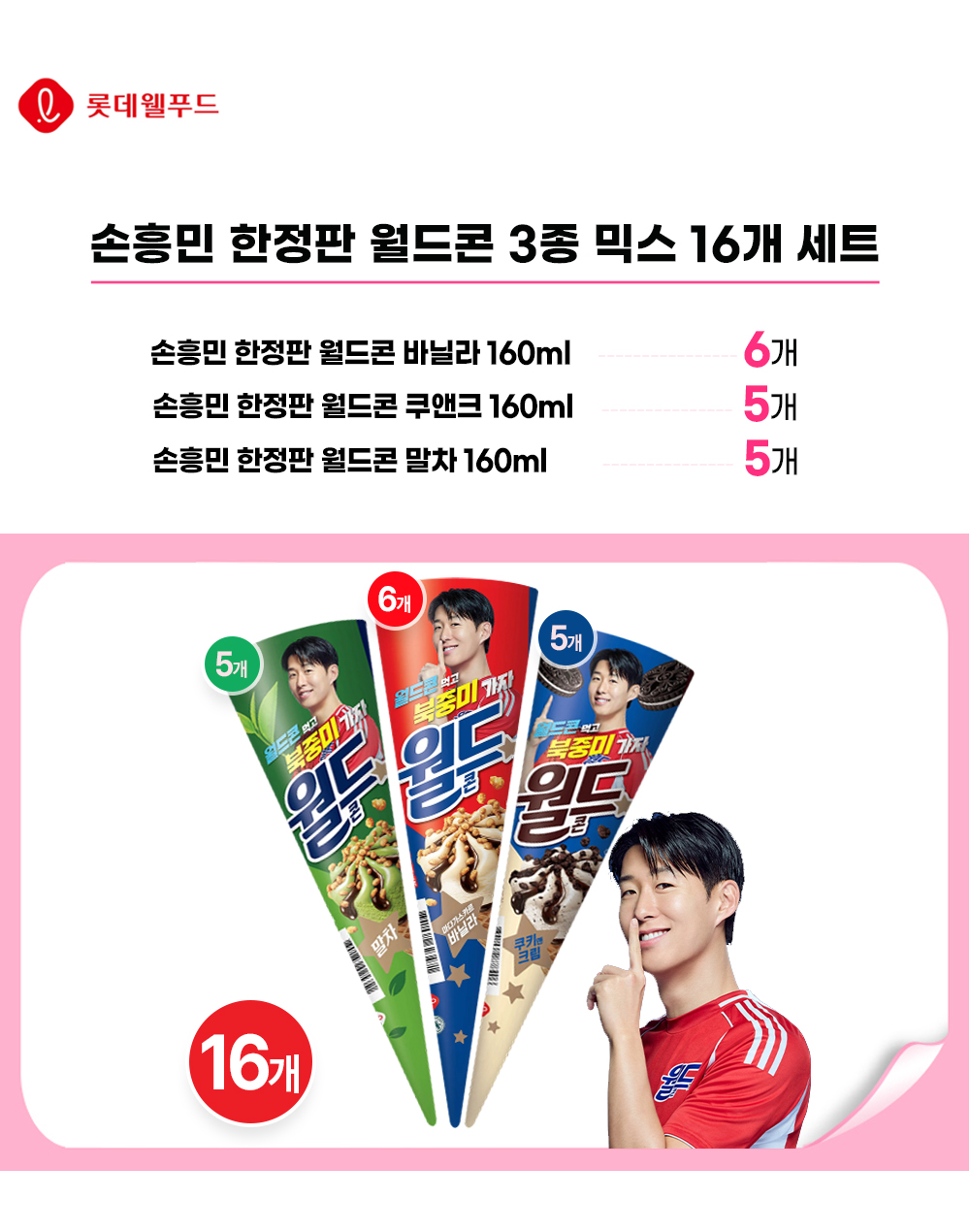 [롯데] 손흥민 한정판 월드콘 3종 믹스 16개 (바닐라 6/쿠앤크 5/말차 5)